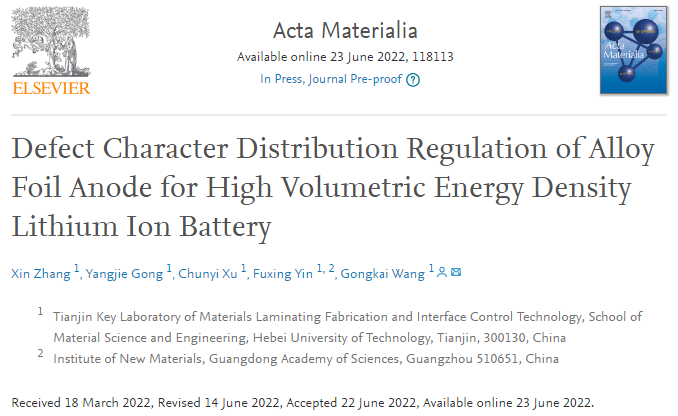 针对上述问题,近期,我院王恭凯副研究员以金属Sn箔为例,通过共晶合金化设计来增加Sn箔内的共晶金属单质框架和其引入的半共格相界,一方面相界可增加快速嵌锂位点,析出的共晶金属单质可提供导电网络,另一方面锂化前端结构转变诱发的位错运动不会在半共格相界处产生塞积,因此可有效缓解锂化应力集中。同时,利用塑性变形和回复再结晶机制,调控金属箔体相自由能,实现了相界和大角度晶界密度的显著增加,进一步提高了其嵌锂动力学,同时缓解应力集中。另外,金属箔体相的位错密度也得到了适当平衡,以免位错密度过高产生位错交割而影响持续的嵌锂驱动力。最终使得Sn箔体积比容量提高了近3倍,达到1200 mAh cm−3,循环稳定性和库伦效率也明显改善,面积比容量达到9 mAh cm−2,远高于文献报道的粉体负极材料水平。因此,通过共晶合金化设计和多尺度特征组织(取向、相界、晶界、位错)调控有望缓解金属箔负极的嵌锂动力学缓慢、嵌锂应力集中等系列问题,从而改善其综合储锂性能,实现低成本、高体积比能量(~1000 Wh L−1)LIBs的突破。该研究成果以Defect Character Distribution Regulation of Alloy Foil Anode for High Volumetric Energy Density Lithium Ion Battery为题发表在国际顶尖期刊Acta Materialia上。https://doi.org/10.1016/j.actamat.2022.118113