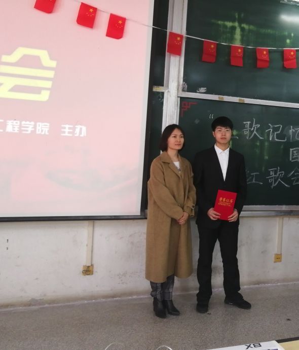 在活动的最后,由艺术教研室材料学院合唱团指导老师孙志虹为获得最佳指挥奖的材料1803班马诗皓同学颁奖: