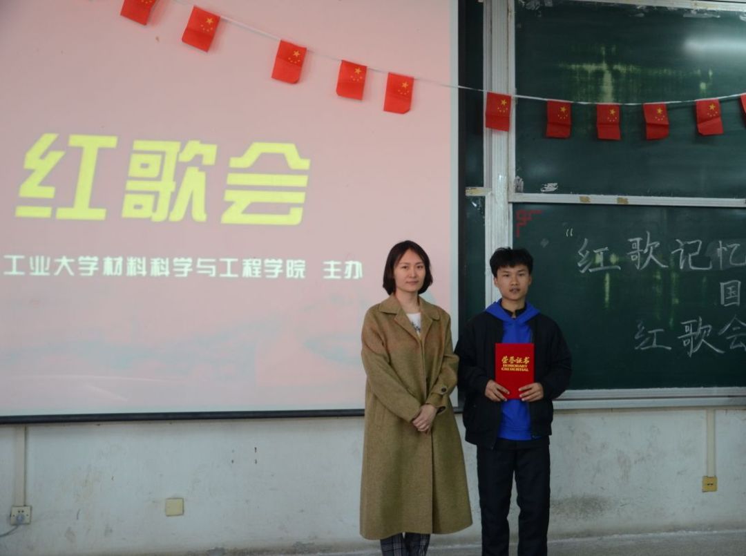 由艺术教研室材料学院合唱团指导老师孙志虹为获得一等奖的材料1801班颁奖: