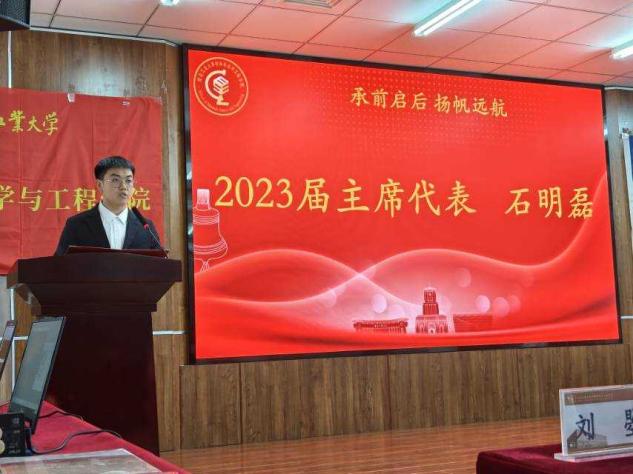 大会第二项,23届主席代表石明磊上台发言,他饱含深情地讲述了在任工作时的感受和对学生会的不舍与留恋,同时对优秀继任者寄予厚望,愿大家再接再厉,为学院赢得新的辉煌。