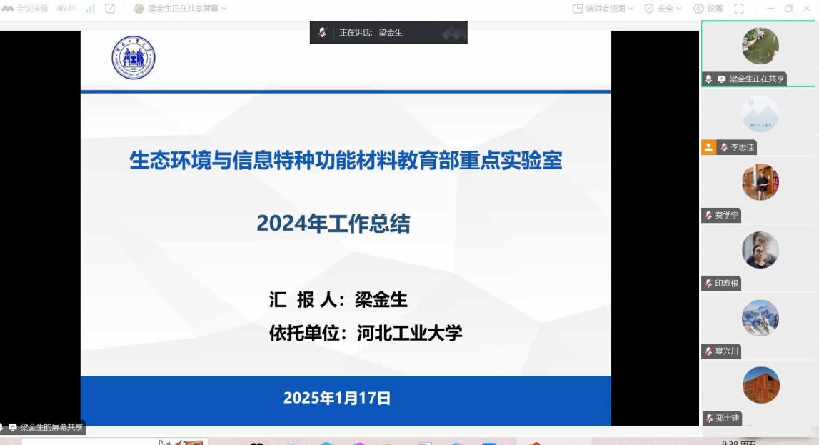 实验室主任梁金生研究员进行了重点实验室2024年度工作总结汇报。梁金生研究员围绕着实验室运行情况、研究水平与贡献、研究队伍建设、学科发展与人才培养、开放交流和未来工作思路等六个方面进行了详细汇报。2024年,实验室针对我国新材料产业发展中的重大科技问题,积极承担国家重点科研任务,并申请河北省和天津市科学技术奖,取得较好成绩。承担国家级科研项目22项,省部级项目28项;获发明专利35项;在Advanced Materials、Journal of Hazardous Materials等期刊发表高水平学术论文85篇。与奥测世纪(天津)技术有限公司等企业合作建立了一批校外产学研实践教育基地,提高了研究生的实践能力和创新能力。同时,实验室负责2024年首届《全国大学生功能材料短视频大赛》华北赛区赛事安排及分赛区成绩评定等工作,河北工大材料学院在大赛中表现突出,获一等奖1项,二等奖5项,三等奖8项,2人获得优秀指导教师。在下一步的工作中,实验室将继续坚持以科学为牵引,以国家需求为导向,加强原创性、引领性的研究工作。