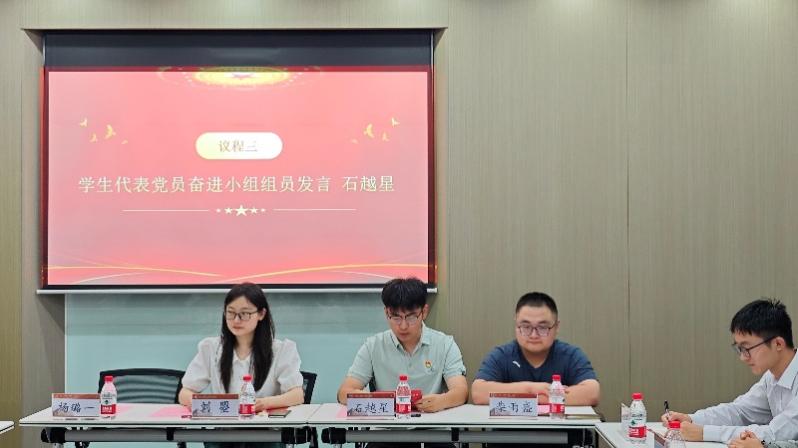 会议第三项由学生代表—党员奋进小组组员预备党员石越星同学发言。石越星同学表示十分感谢学院的栽培与信任,今后将以更加饱满的热情、更加务实的作风、更加扎实的态度,投入到小组的学习和工作中,将不断提高自己的政治觉悟和理论水平,为党的事业贡献自己的力量。