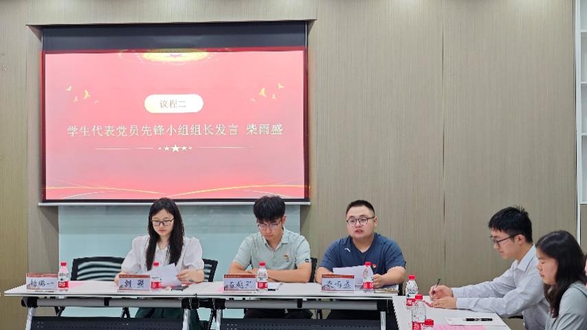 会议第二项由学生代表—党员先锋小组组长柴雨盛同学发言。柴雨盛同学表示理论学习是党员的基本功,也是提高政治觉悟和党性修养的重要途径。今后,他将始终牢记学校学院的培养,将所学知识运用到实际工作中去,以实际行动回报学校、学院的栽培。
