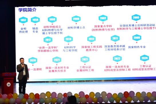 郑士建在发言中分享了学院的发展历程与学科成就,从人才培养、学科发展等角度介绍了学院情况,并表达了对新生们勇攀材料高峰的期盼。