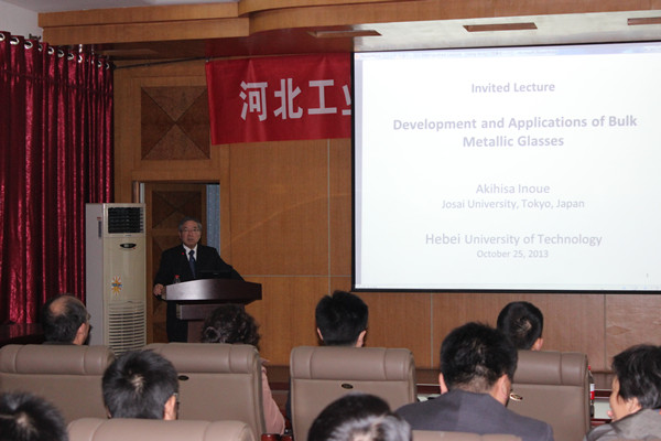 来访期间,井上教授在图书馆报告厅作了题为“块体非晶合金的研究现状、应用及展望”的学术报告。详细地阐述了目前块体非晶研究领域的最新研究成果及应用。我校近100名师生参与了学术报告,并对井上教授的报告报以热烈掌声。