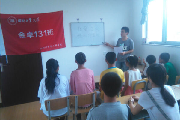 金材卓131班暑期社会实践队是校级重点队,全班30名学生在张建新院长、武建军教授、孙继兵教授的指导下,在张家口、承德、秦皇岛、保定、邯郸、天津等地开展了一系列有关有关习近平总书记系列重要精神讲话和社会主义核心价值观走进、影响农村乡镇及城市社区生活的调研。在农村乡镇及城市社区进行习近平总书记系列重要精神讲话和社会主义核心价值观的宣传活动,与基层群众共同学习习近平总书记系列重要精神讲话和社会主义核心价值观。