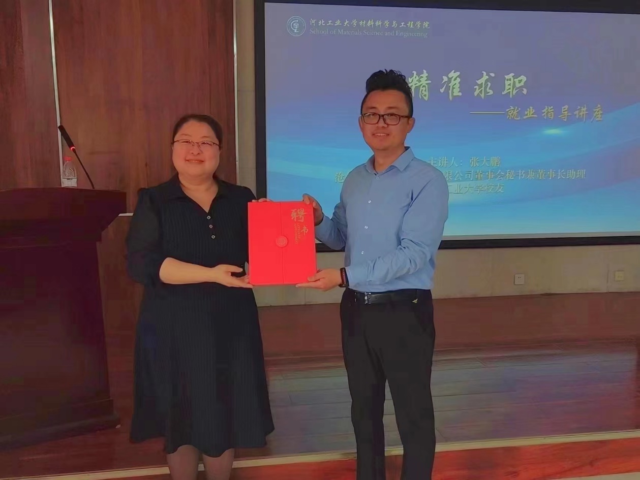 会后,学院特别聘请张大鹏校友作为材料科学与工程学院“就业指导校外导师”,正处级辅导员张雪莹为其颁发聘书。
