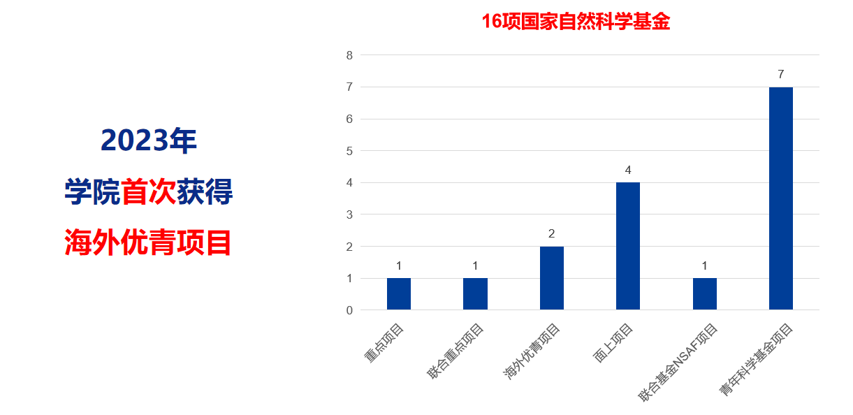2023年,学院共获批国家自然科学基金项目16项,其中重点项目1项,联合基金重点项目1项,优秀青年科学基金(海外)项目2项,面上项目4项,青年科学基金项目7项,其他类型项目1项,在承担重点项目和海外优青项目上面取得新突破。