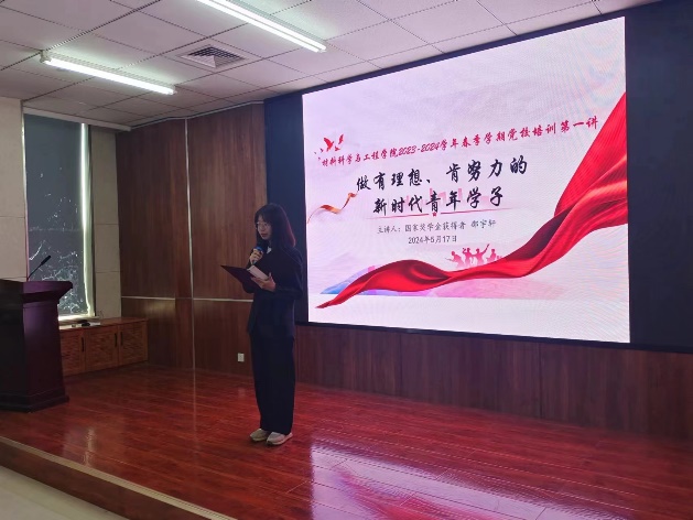 2024年5月17日,材料科学与工程学院2023-2024学年春季学期党校培训第一讲在材料楼C514开展。本次培训以“做有理想,肯努力的新时代青年学子”为主题,邀请了“国奖团”成员、材料学院博士生邵宇轩担任主讲人,旨在通过朋辈引领,以榜样力量做青年学生“引路人”。本次党课我院发展对象、预备党员百人参会。