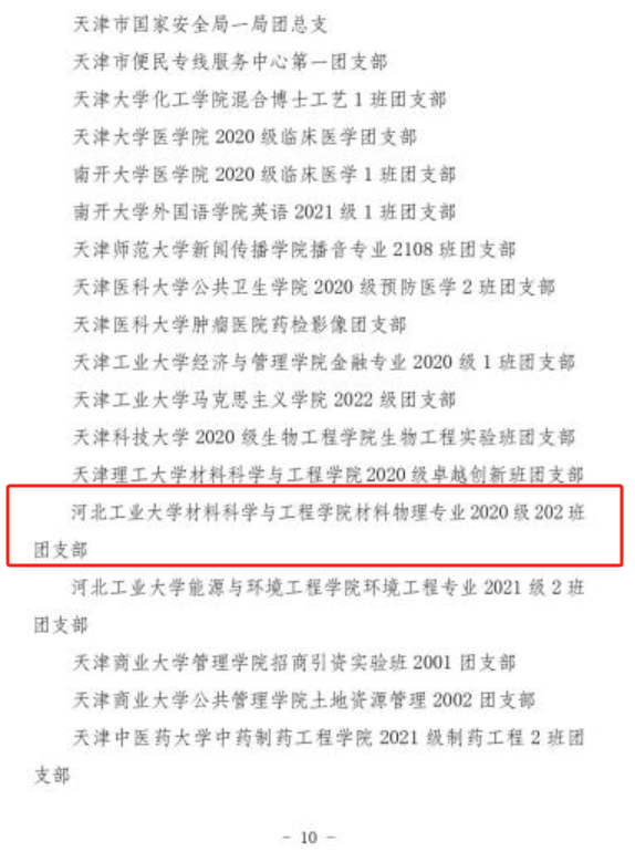 根据天津共青团发布《关于表彰第23届天津青年五四奖章(集体)、2023 年天津市五四红旗团委(团支部)、天津市优秀共青团员、天津市优秀共青团干部的决定》,我院材物202团支部名列其中,获评2023年天津市五四红旗团支部荣誉称号!