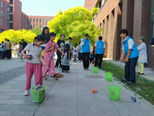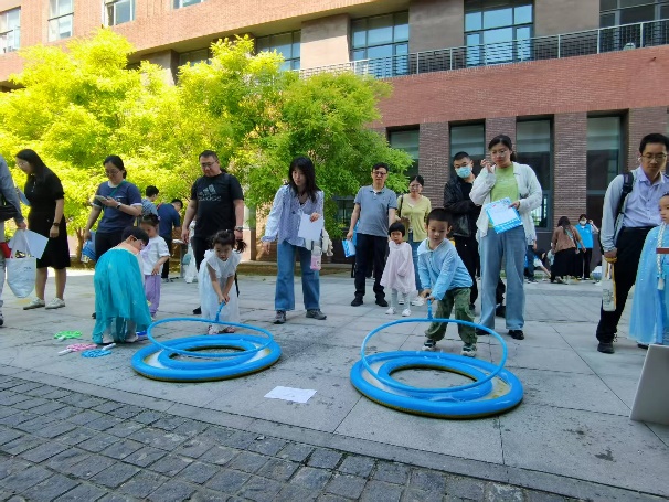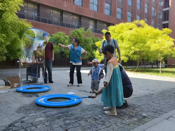 随后老师和家属回到学院楼下,在户外进行了套圈、吹泡泡等趣味游戏,并为家属们盖章打卡,赠送礼品。