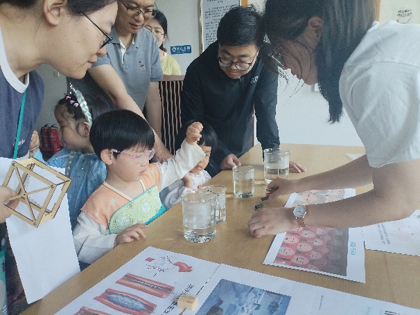 在材料楼,老师和志愿者们向家属们展示3D全息投影模拟实验、神奇的形状记忆合金、锌树开花、磁力小钓手等有关材料科学的小实验,并设计手工和游戏环节让家属们亲身参与,切身感受材料科学之美。