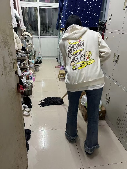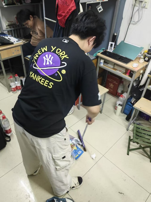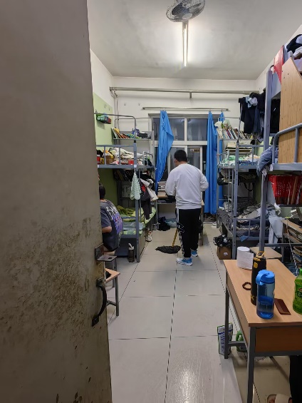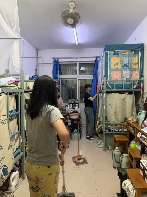 在整理过程中,同学们认真对照评分标准,从寝室整体布局到细节清洁,从日常用品归类到用电安全检查,逐项落实,主动作为。有人擦拭门窗,清扫地面,消除卫生死角;有人集中整理书桌与床铺,确保物品摆放整齐有序;还有宿舍成员协同合作,对公共区域进行全面清理,力求以整洁、安全、规范的状态迎接初筛评审。