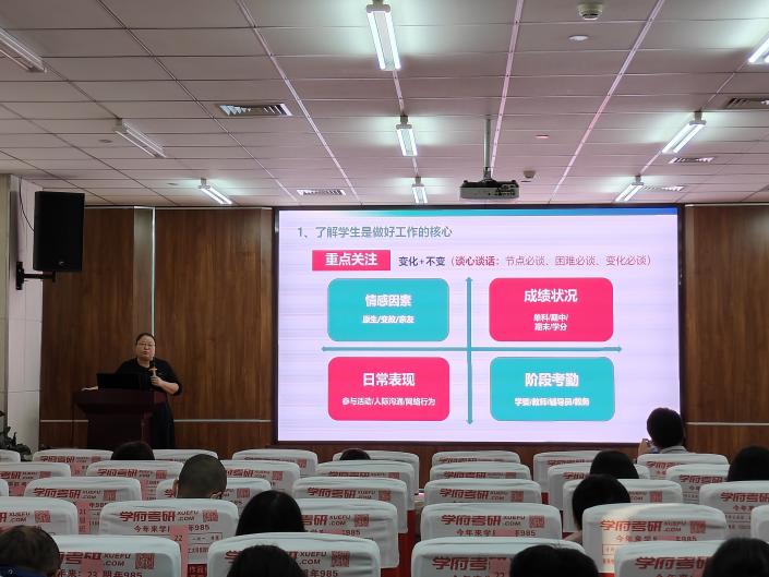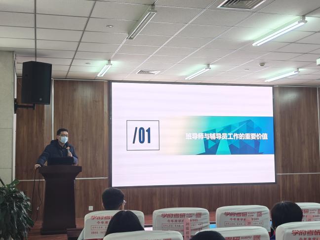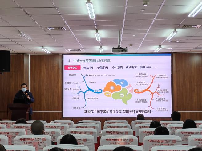 首先,赵庚从“教育·管理·服务”三个角度对班导师、研究生导学团队兼职辅导员的岗位职责进行了解读,同时提出了相应要求。他说到,班导师在学生成长的过程中最明显的优势体现在“点”上,发挥专业优势,提高学生的专业认同度和投入度;辅导员的工作特点集中在“面”上,因此也要与所带班级辅导员建立良好的沟通,形成工作最大合力,共同解决学生遇到的学习生活中遇到的各类问题。