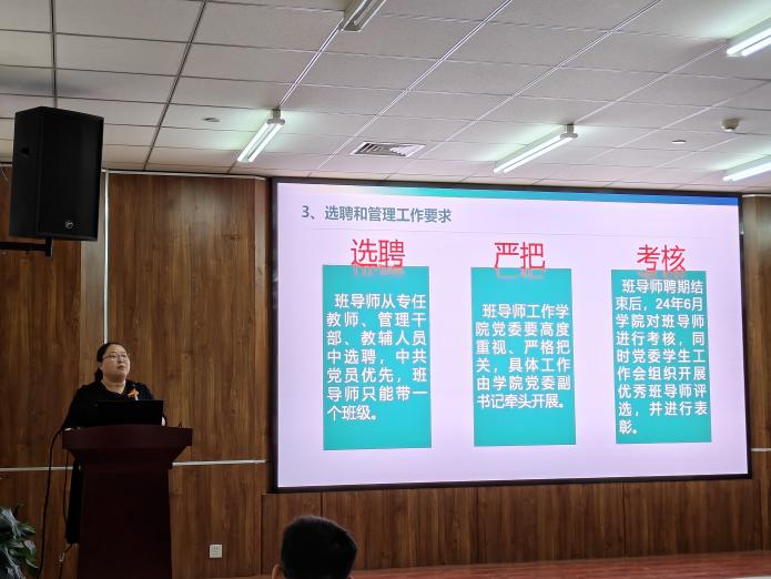 其次,张雪莹结合多年的学生工作为在场教师分享工作上的方式方法。她说到,做好学生工作,了解学生是核心,内部协同是保障,发挥优秀班导师的特质是关键,同时鼓励班导师从关心学生、时间投入、方向引领三个方面多下功夫。然后张雪莹就学工系统的操作使用对班导师进行培训。