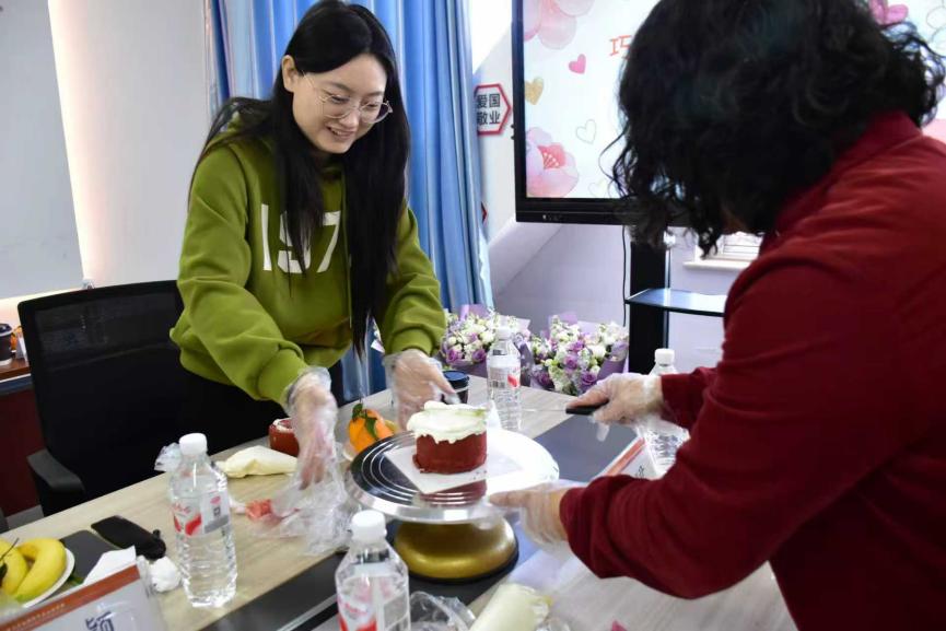 座谈会后,蛋糕烘焙 DIY 活动温馨开启。津乐园专业烘焙师现场指导,女教职工们亲手搅拌、塑形、裱花,在指尖创意中体验烘焙乐趣。大家相互协作、分享技巧,一个个造型别致的蛋糕逐渐成型,香甜气息弥漫现场,不仅提升了生活技能,更在分享甜蜜中增进了情谊。